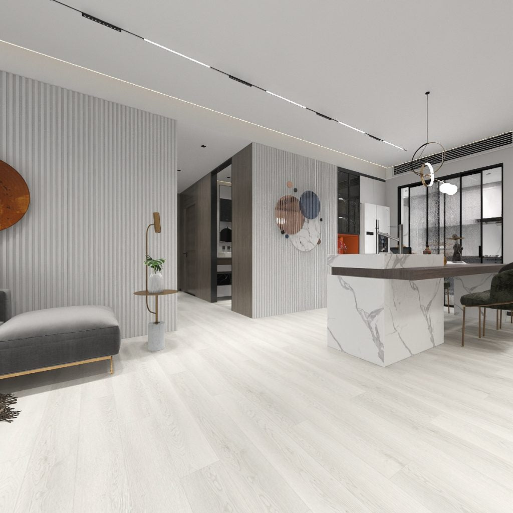 - Scratch Resistant and Waterproof: Engineered to withstand daily use, the flooring’s surface layer provides strong protection against scratches from furniture, pets, and foot traffic. Its waterproof core ensures that spills, moisture, and humidity will not cause swelling, warping, or damage — making it ideal for kitchens, bathrooms, and high-traffic areas.